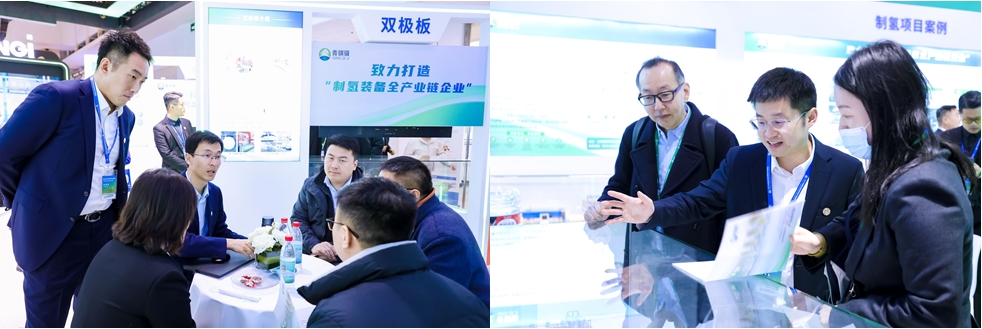 此次展会上,,尊龙时凯碱性电解槽制氢成套系统、、、、催化剂、、、双极板系列产品集体亮相,,,,致力打造“氢能装备全产业链企业”,,,,引众多国内外领导、、、、行业专家和参观者驻足参观,,,,并现场进行深入讨论交流。。